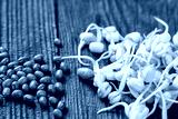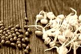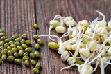 Sprouted mung beans on a wooden table. Healthy bean sprouts. Sprouted and dried beans.