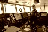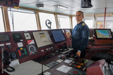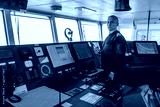 Officer on watch with radio on the navigational bridge. Caucasian man in blue uniform sweater on the bridge of cargo ship.