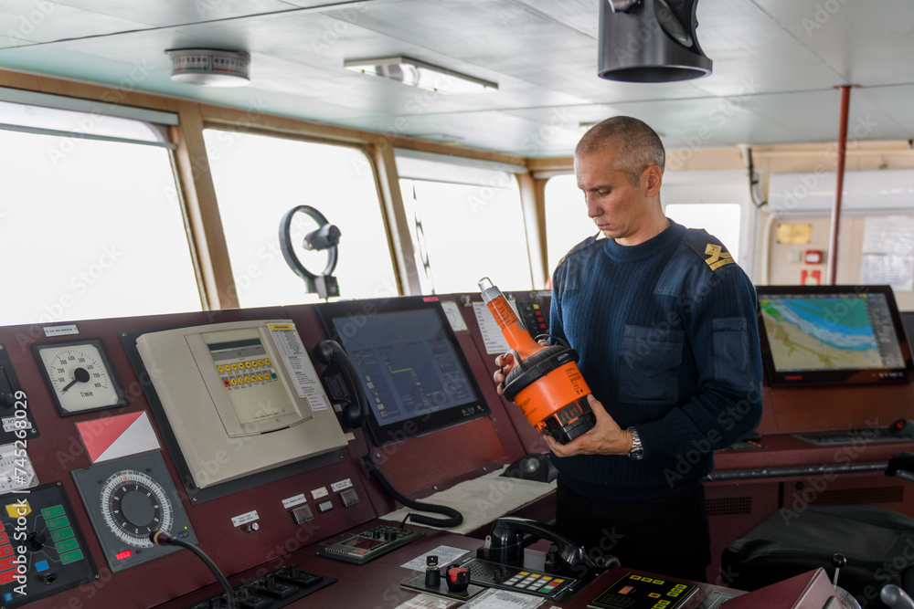 Officer on watch with EPIRB on the navigational bridge. Caucasian man in blue uniform sweater using emergency position indicating radio beacon on the bridge of cargo ship.
