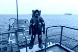 Seaman wearing Immersion Suit on Muster station. Abandon ship drill. Free fall boat. Cargo vessel.