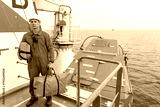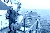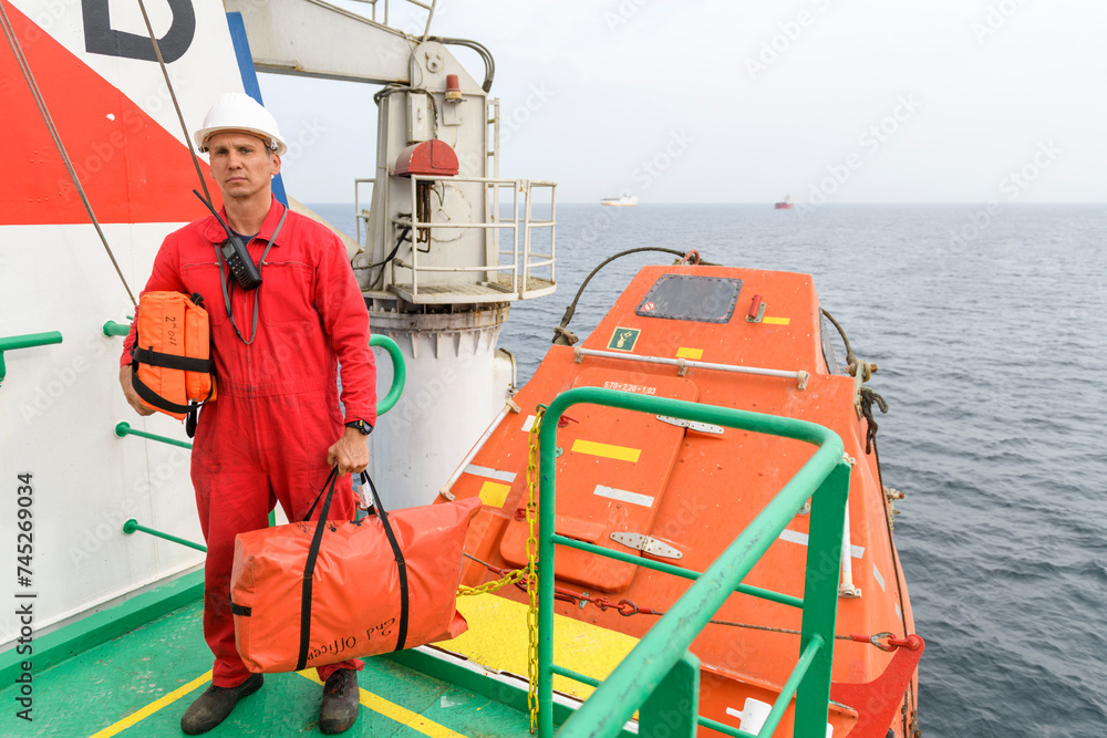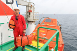 Seaman wearing lifejacket with vhf radio on Muster station. Abandon ship drill. Free fall boat. Cargo vessel.