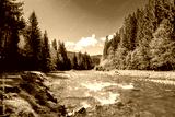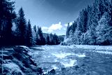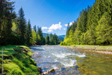 carpathian nature scenery with river on a sunny day in spring. trees along shore and forest on the hill. mountainous landscape of ukraine beneath a blue sky with fluffy clouds