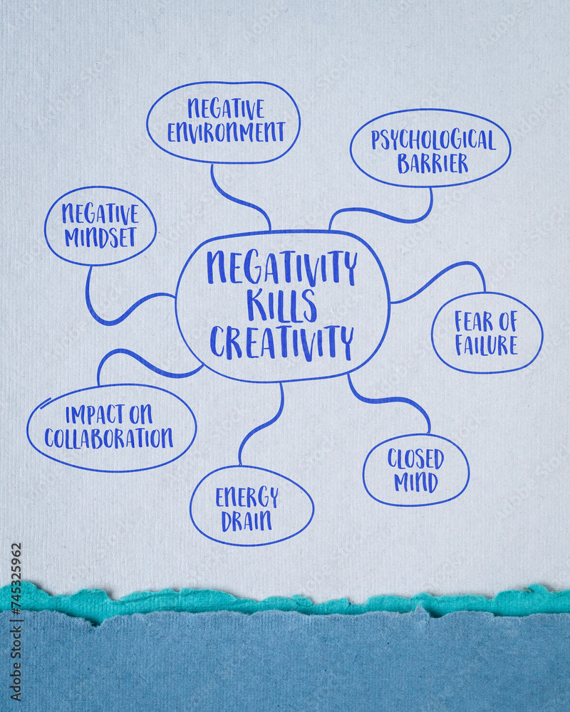 negativity kills creativity mind map sketch on art paper, negative mindset and environment, fear of failure concept