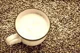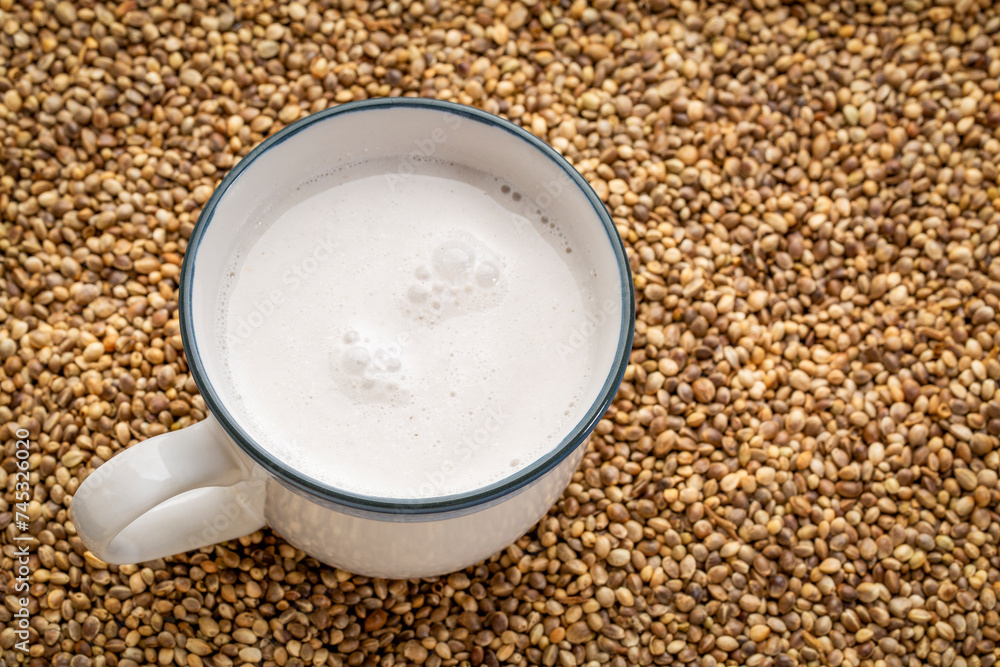 cup of hemp milk against dry hemp seed background