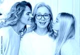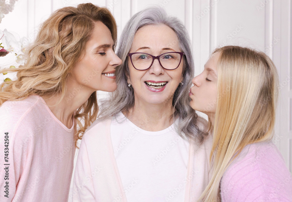 Three generations of women, from grandmother to granddaughter, share moment of joy and love, kissing near flower compositions