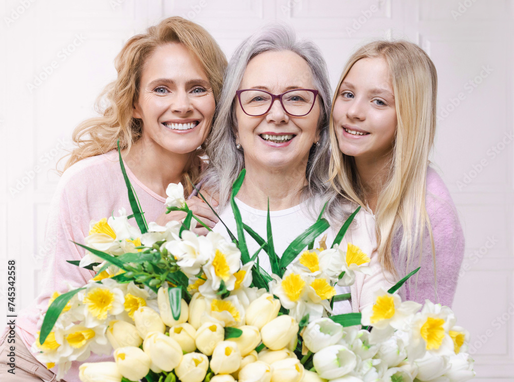 Birthday bouquet for grandma, tulips and daffodils gifted with love by daughter and granddaughter. Portrait of three generations of women