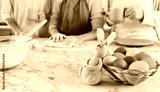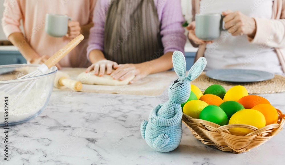 Basket with colorful eggs and Easter bunny on kitchen table during preparation to celebrate Easter holiday. Female part of family kneading dough for holiday pies and Easter bread
