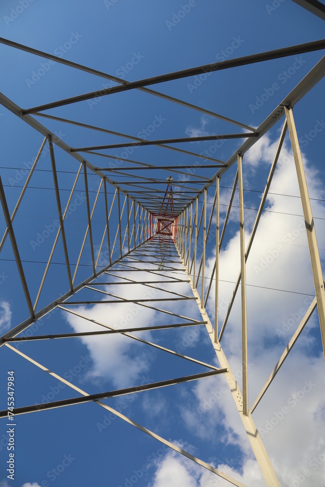 high pylon with high voltage cables for the transport of electricity and clouds on the sky