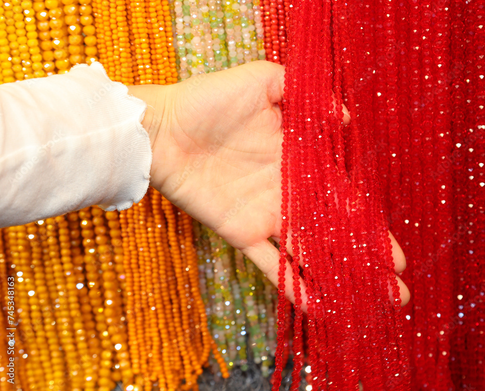 girl is shown selecting a necklace of colorful gemstones for sale at the jewelry store