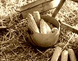 yellow Ears of corn which are inside the pot lying on the straw after being harvested