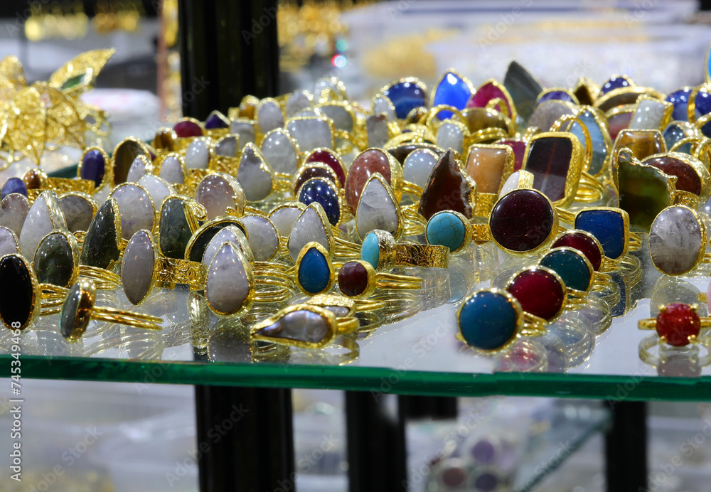 golden rings and bracelets with precious colored stones in the shop window of costume jewelery for sale