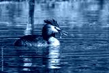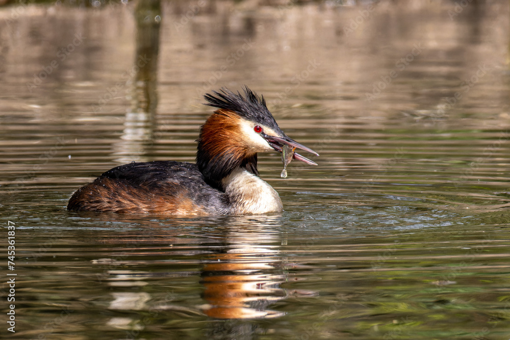 Great Crested Grebe, Podiceps cristatus has caught a fish.