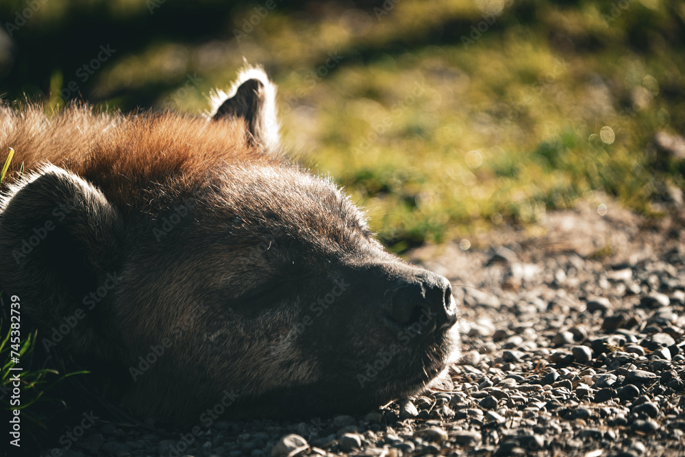 close up portrait of the head (sleepy) of a spotted hyena, sleeping, fur, close up