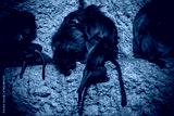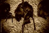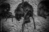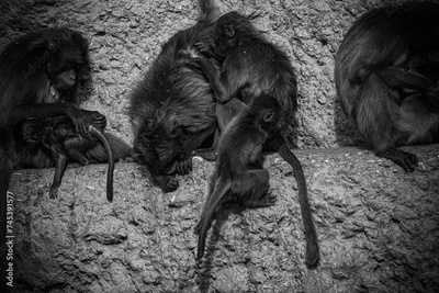 family of baboons grooming each other, vlooien, monkey baboon family - black and white portrait