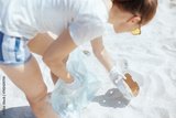 Closeup on environment activist on beach collecting garbage