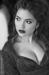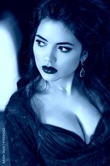 Brunette gorgeous young woman with red lips wearing in red dress