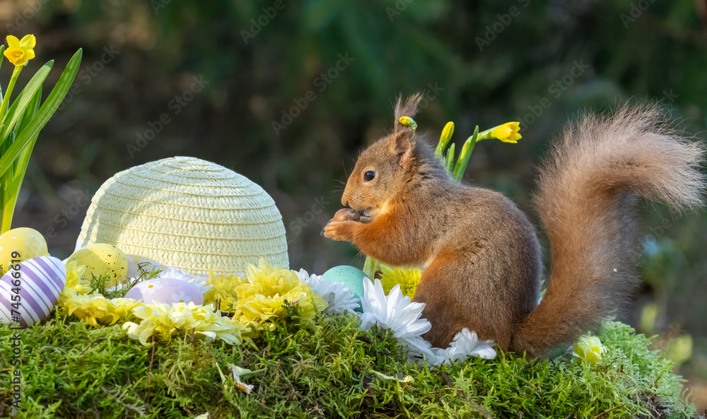 Little scottish red squirrel with Easter eggs and easter bonnet with daffodils in spring scene and flowers in the forest