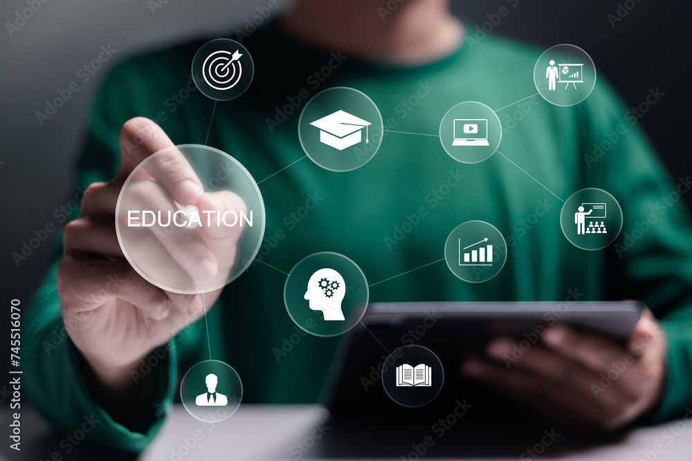 E-learning education concept, learning online with webinar, video tutorial, internet lessons. Person use tablet and hand touching E-learning icon on virtual screen.
