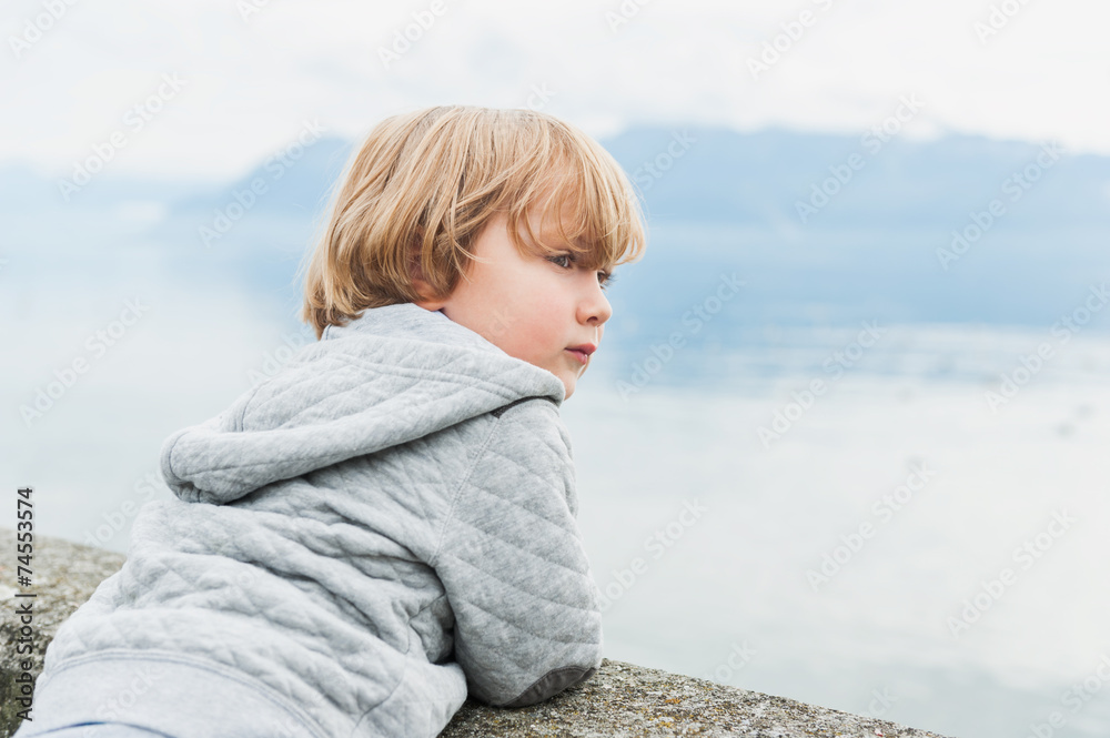 Adorable toddler boy resting by the lake on a fresh day