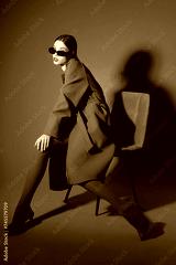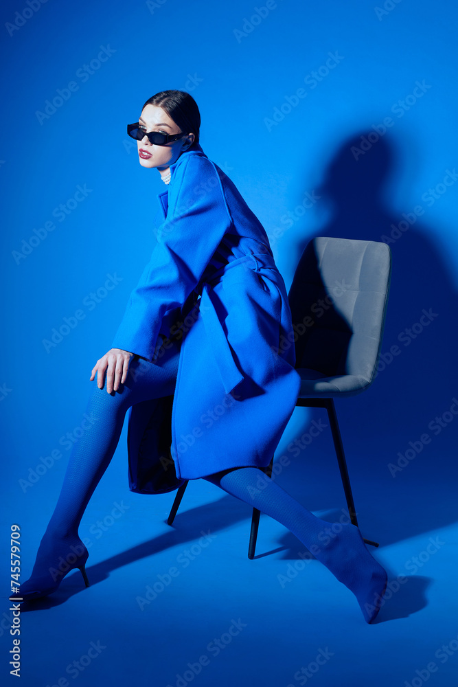 fashion portrait of young elegant woman in blue coat.