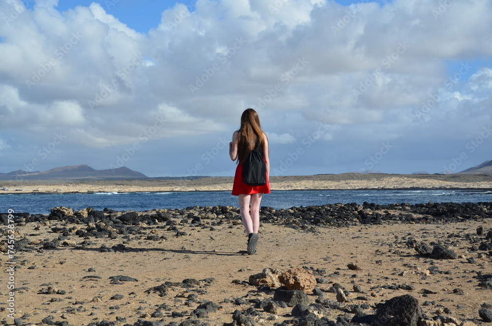 A white woman with long brown hair, wearing a red dress and a black T-shirt, walking on a volcanic beach in the Canary Islands - Fuerteventura. He looks at the waves of the blue Atlantic Ocean