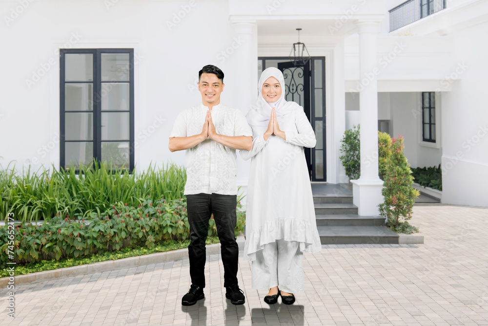 Muslim family of two adults showing greetings gesture in front of house