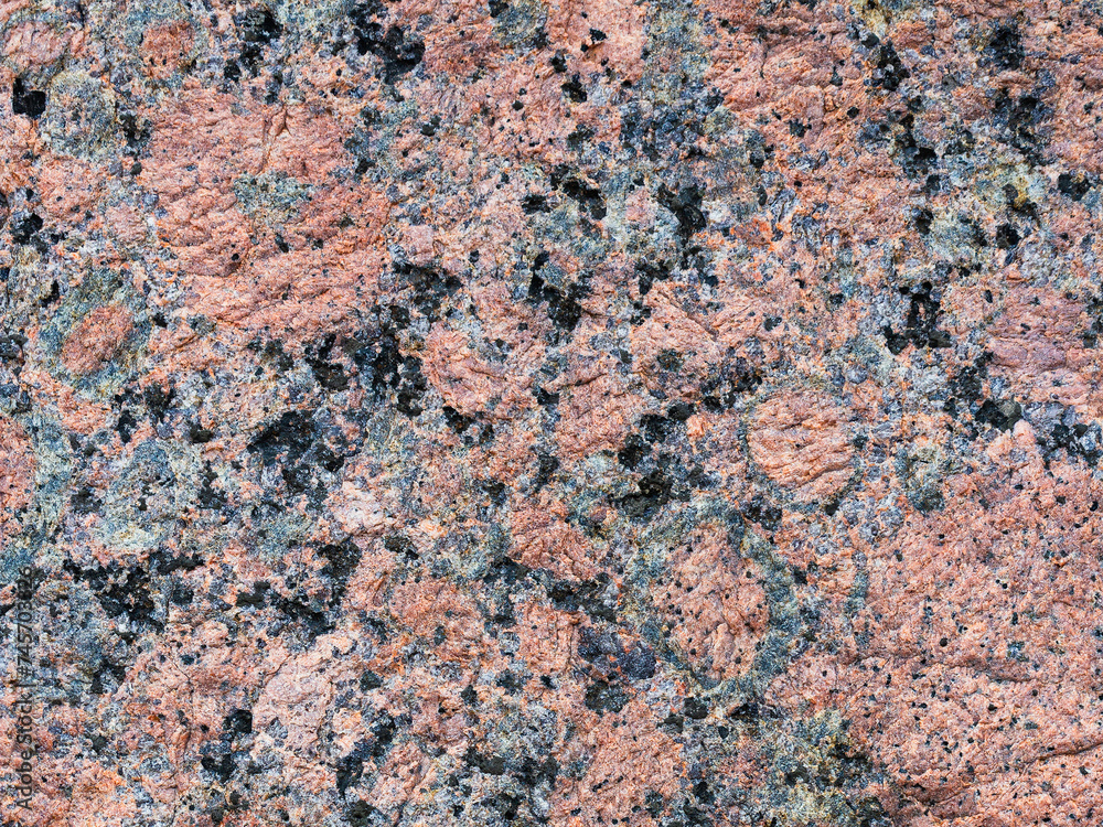 Granite texture. Natural pink granite with a grainy pattern. Stone background. Solid rough surface of rock. Durable construction and decoration material. Close-up.