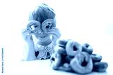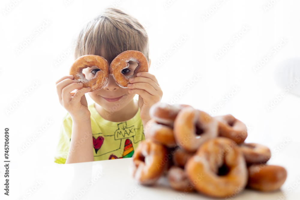 Cute school child, boy, eating doughnuts at home, homemade fresh donuts with sugar