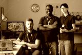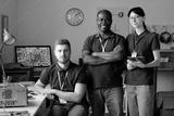 Team of successful intercultural technicians in blue uniform looking at you while standing in front of camera in repair service office