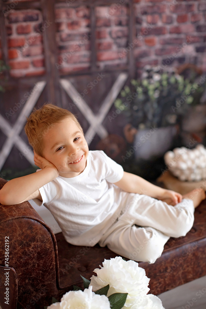 Sweet toddler child, cute boy playing with Easter eggs, Easter decoration