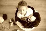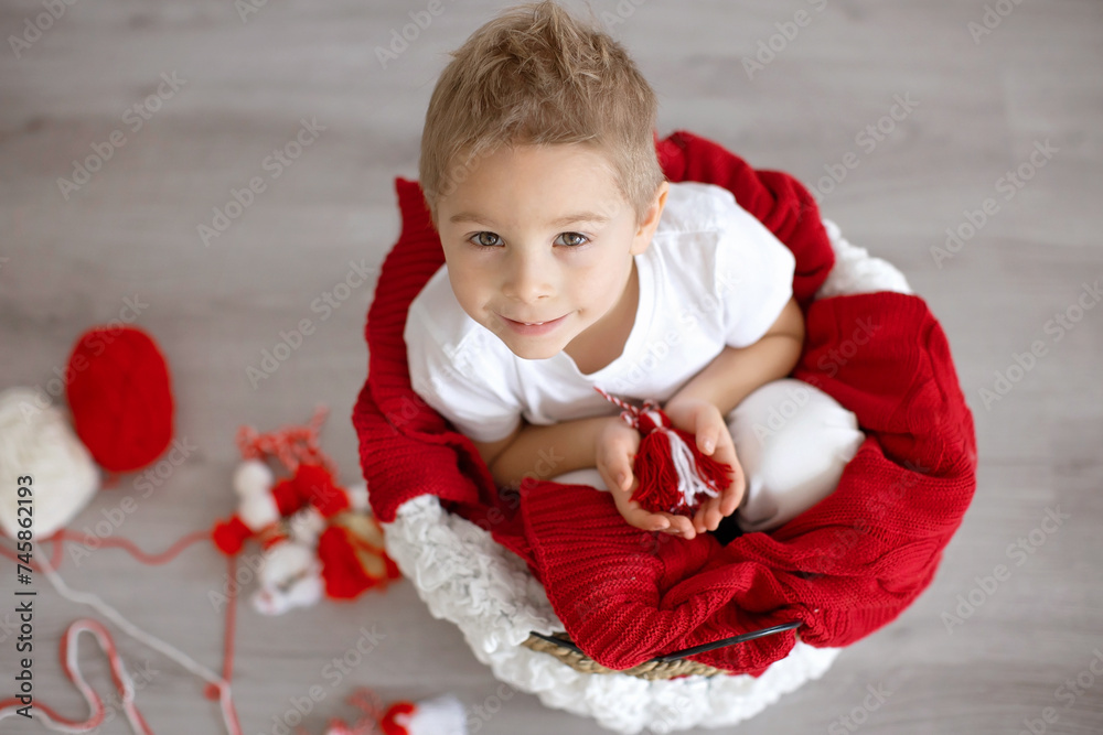 Cute child, blond boy, playing with white and red bracelet, martenitsa