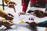 UX, UI designers collaborate to design user interfaces for smartphone apps based on user experience. Colleagues meeting, program designers brainstorm to discuss designing mobile applications.
