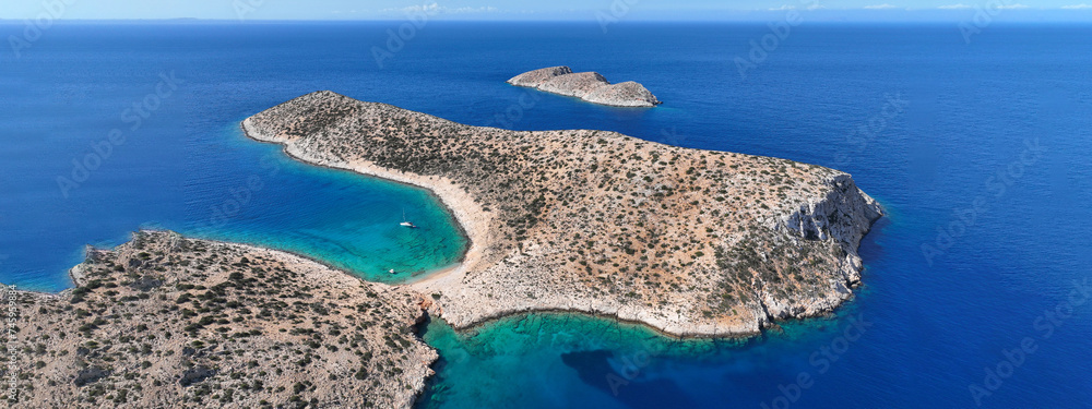 Aerial drone ultra wide photo from tropical exotic paradise secluded rocky island bay with deep turquoise sea forming a blue lagoon visited by yachts and sail boats in Caribbean exotic destination