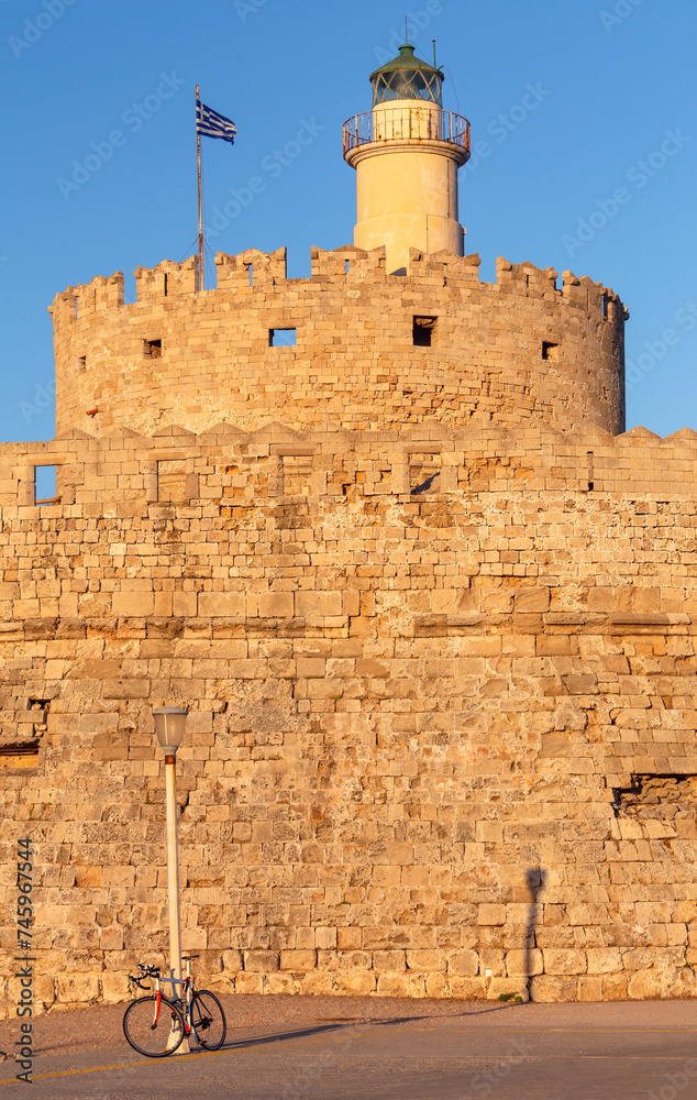 Old stone lighthouse illuminated by the sun at Fort St. Nicholas in Rhodes early in the morning.