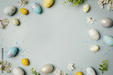 Happy Easter composition for easter design. Elegant Easter eggs and flowers on pastel blue background. Flat lay, top view, copy space.