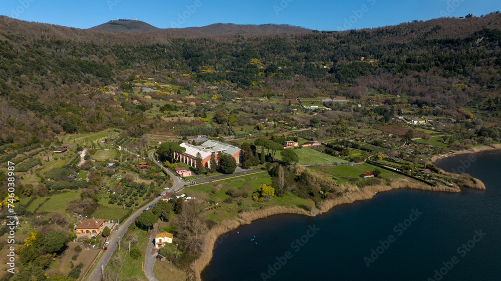 Aerial view of the Roman Ship Museum in Nemi, near Rome, Italy. The palace was built to house two gigantic ships that belonged to the emperor Caligula and were recovered from the lake.