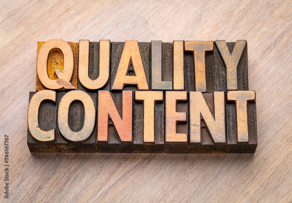 quality content - word abstract in vintage letterpress wood type blocks, blogging and media concept