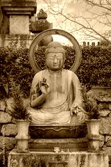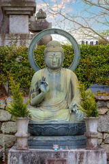 A seated bronze Buddha statue at Kurodani temle in Kyoto, japan