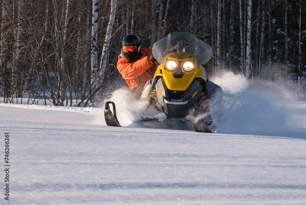 Athlete on a snowmobile moving in the winter forest in the mountains of the Southern Urals