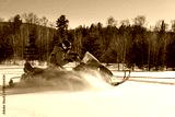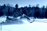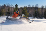Athlete on a snowmobile moving in the winter forest in the mountains of the Southern Urals