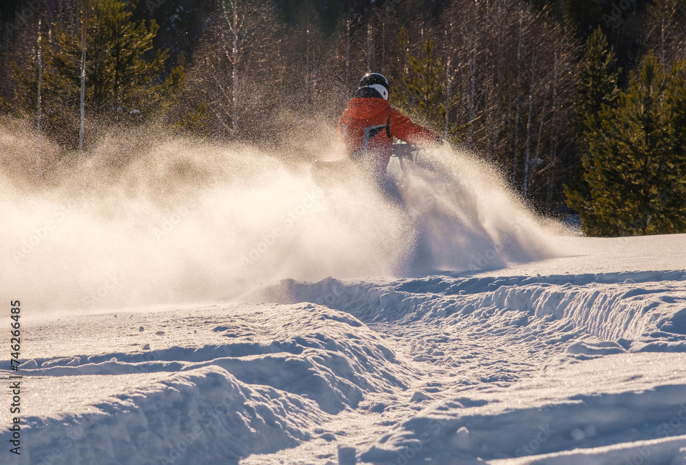 Athlete on a snowmobile moving in the winter forest in the mountains of the Southern Urals