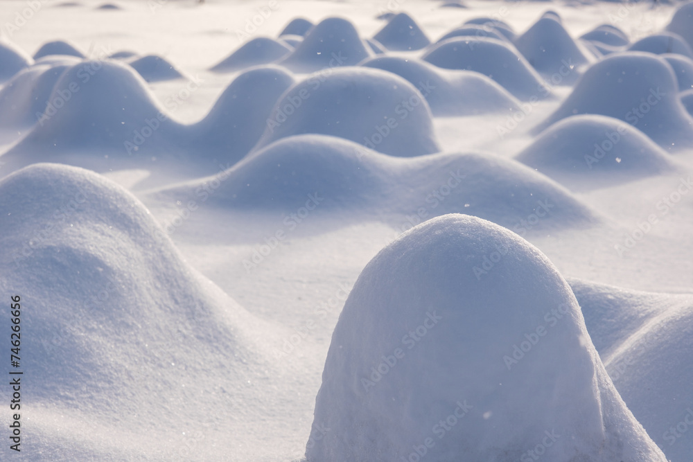 Hummocks in a swamp covered with snow in winter on a sunny day