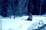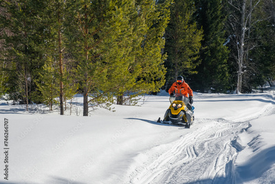 Athlete on a snowmobile moving in the winter forest in the mountains of the Southern Urals