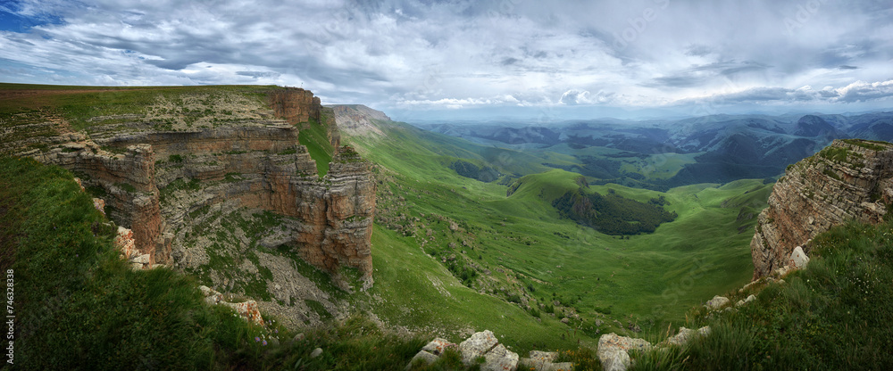 Landscape of Caucasus Bermamyt Canyon, stunning natural wonder awaiting adventurers. Mountains and rocky cliffs create a breathtaking panorama. Ancient geological formations and rugged beauty