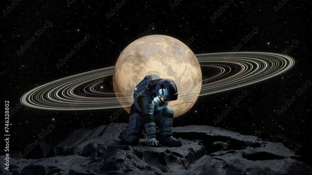 Space astronaut explores distant planet. Cosmonaut in a spacesuit touches the ground of an asteroid. 3d render