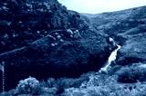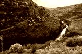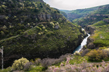 Panoramic view of the Aksu canyon with a river in the rocks in spring in Kazakhstan