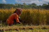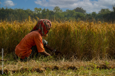 Bangladeshi old farmer harvesting paddy. Rice fields of Bangladesh. Sunburned farmer's face. Farmers are now happily reaping the ripe paddy.