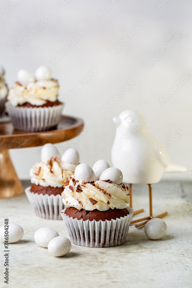 Chocolate cupcakes with cream cheese nest, egg shaped sweet candies and grated chocolate. Bird statue. Holiday homemade dessert. Vertical image.