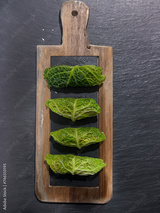 Baked cabbage rolls stuffed with minced beef with carrots and rice in tomato sauce..