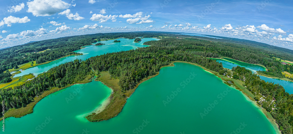Ausblick auf die idyllische Landschaft der Osterseen südlich von Seeshaupt im bayerischen Oberland